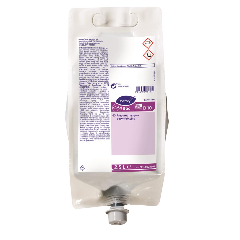 Suma Bac D10 je vhodný na povrchy v potravinárskych prevádzkach. Kombinácia katiónových povrchovo aktívnych látok, sekvestračných činidiel v pufrovacom systéme zaisťujú účinnosť voči širokej škále mikroorganizmov nezávisle od tvrdosti vody. Obsahuje tiež povrchovo aktívne látky, vďaka ktorým je produkt vhodný na jednokrokové čistenie a dezinfekciu.